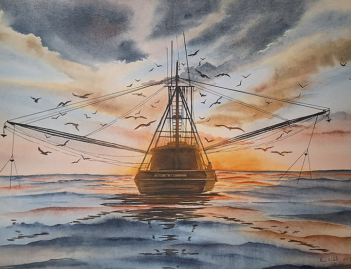 Silhouetted against a sky streaked with amber, lavender, and indigo, the boat stands steady on gently rippling waves, its rigging outstretched like wings. A flurry of seabirds circles above, drawn by the day’s final catch.